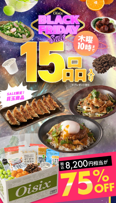 オイシックスでは総額8,200円相当の賞品が入ったお試しセットを75%OFFの1,980円で購入できるキャンペーンを実施しています。