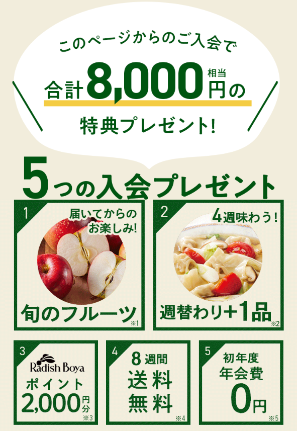 らでぃっしゅぼーやでは8,000円相当のプレゼントがもらえる入会キャンペーンを実施しています。