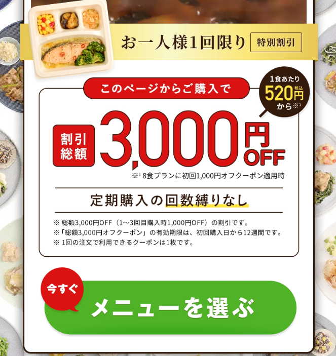 当サイトからナッシュを申込むことで初回から3回目の購入まで各1,000円の割引を受けることができます。