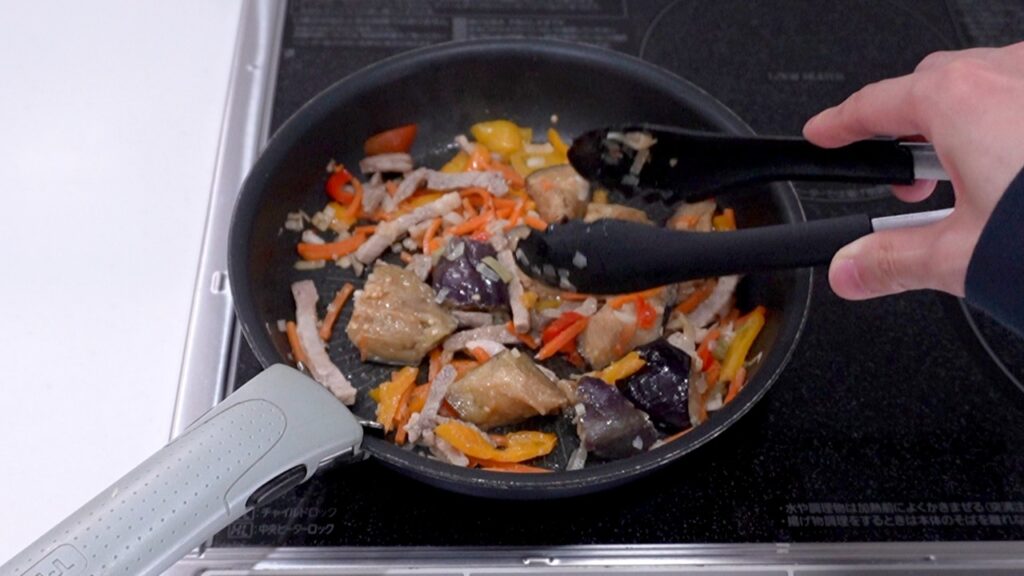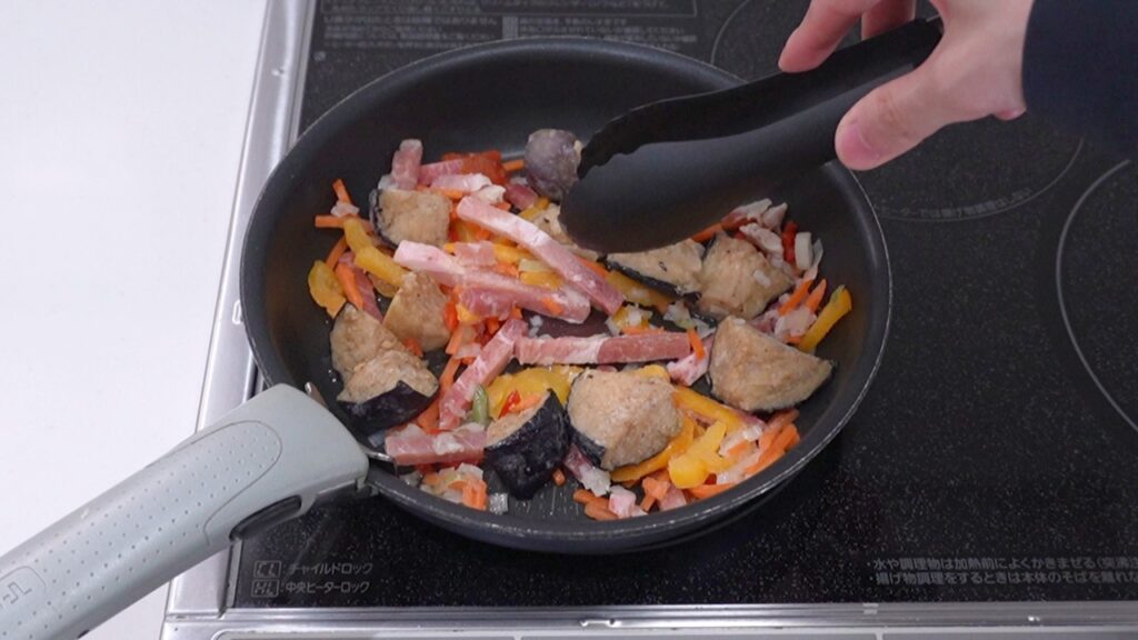 冷凍のままフライパンで具材を炒めます。