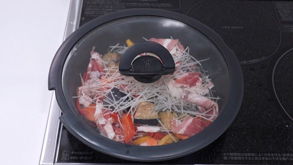 フライパンに具材と水を入れ蒸し焼きにします。