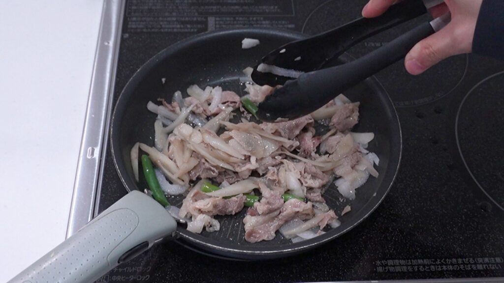 油を引いたフライパンで具材を温めます。