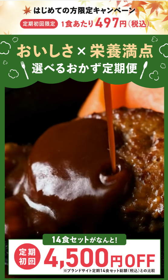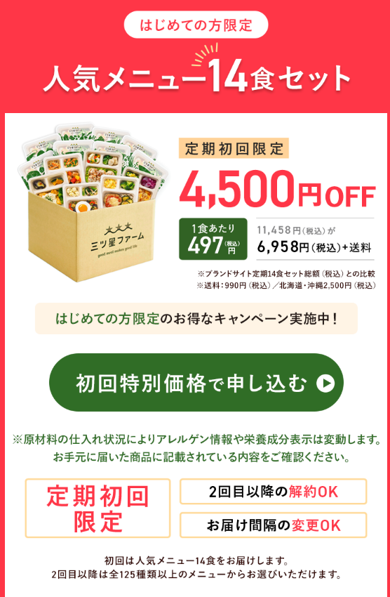 三ツ星ファームでは、14食コースを初回4,500円OFFで購入できるキャンペーンを開催しています。(※ブランドサイト定期14食セット総額(税込)との比較)